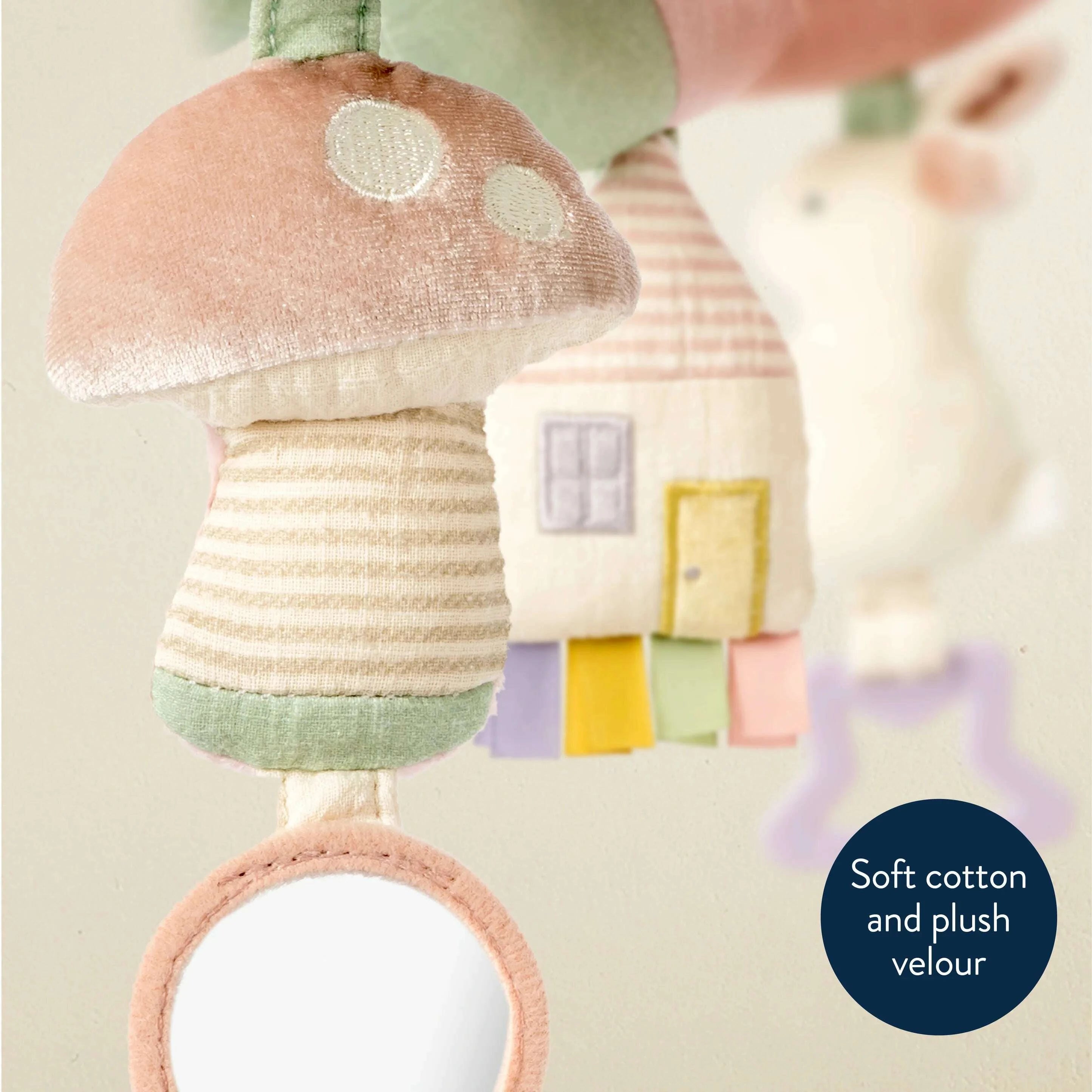 Watch as your babe reaches for the dangling veggie rings, smiles at their reflection in the hanging mirror, and grasps for the ribbons keeping their little hands busy. Natural cotton fabrics are gentle & soft to baby’s touch. For the many travels ahead, easily attach Itzy Bitzy Spiral™ to car seats and stroller for fun on-the-go!