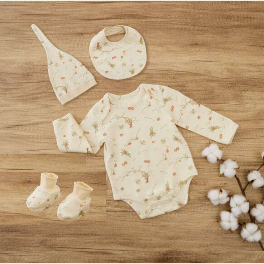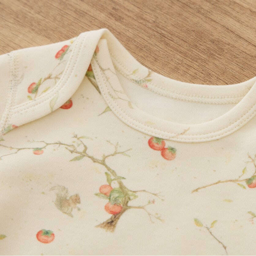 Everything your little one needs in one cozy, stylish set—crafted from organic fabric, naturally dyed, and featuring a charming woodland print with persimmons.