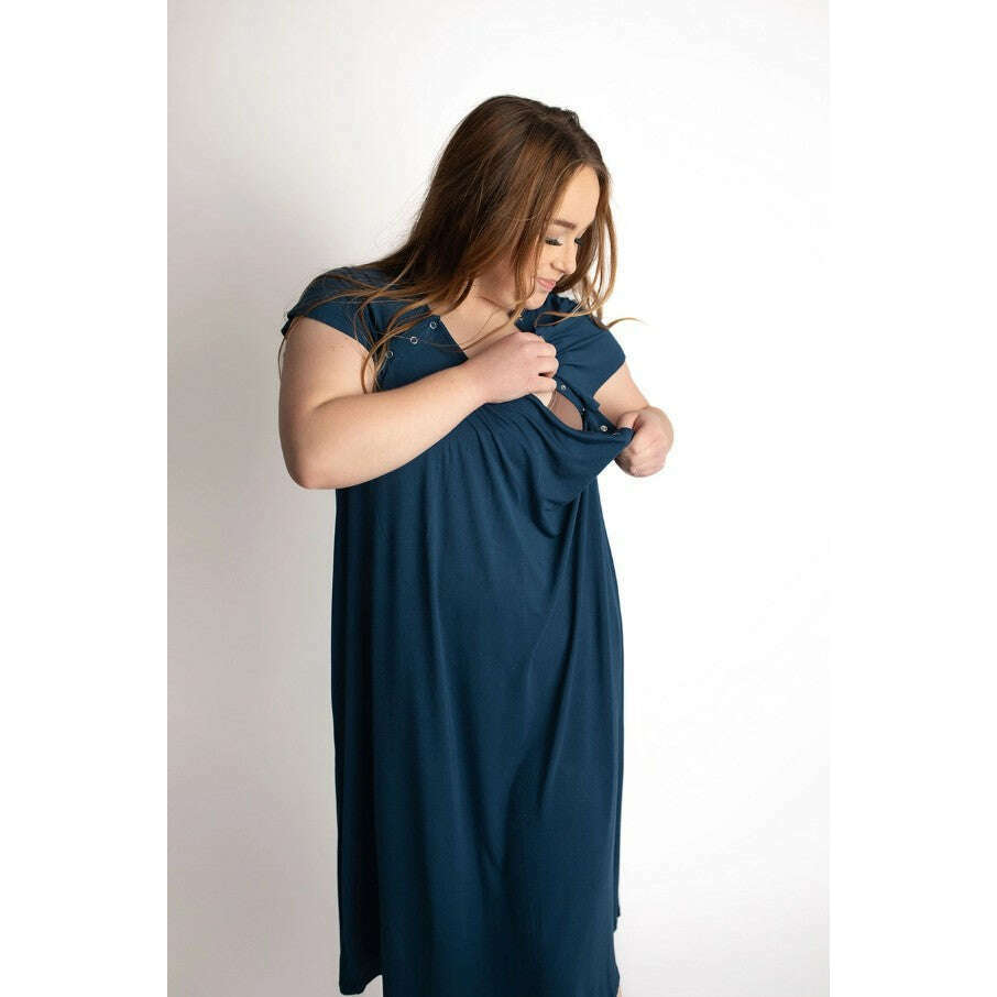 The buttery soft fabric stretches as a comfortable nightgown option for your growing belly at every stage. The easy-to-use snaps on the shoulder make it easy to breastfeed in the middle of the night. Honestly, you might never wear anything else as they are just that comfy!