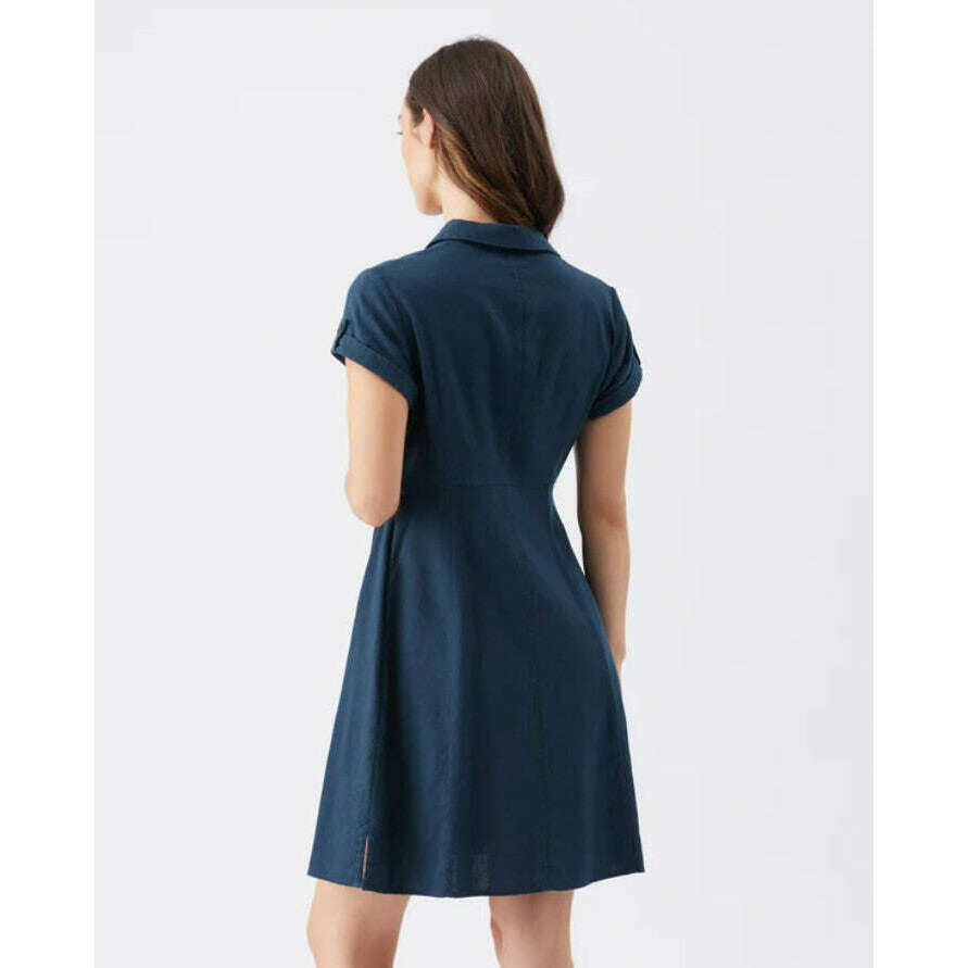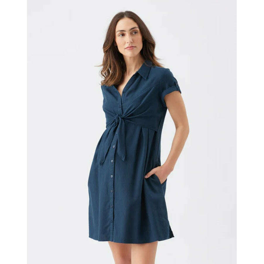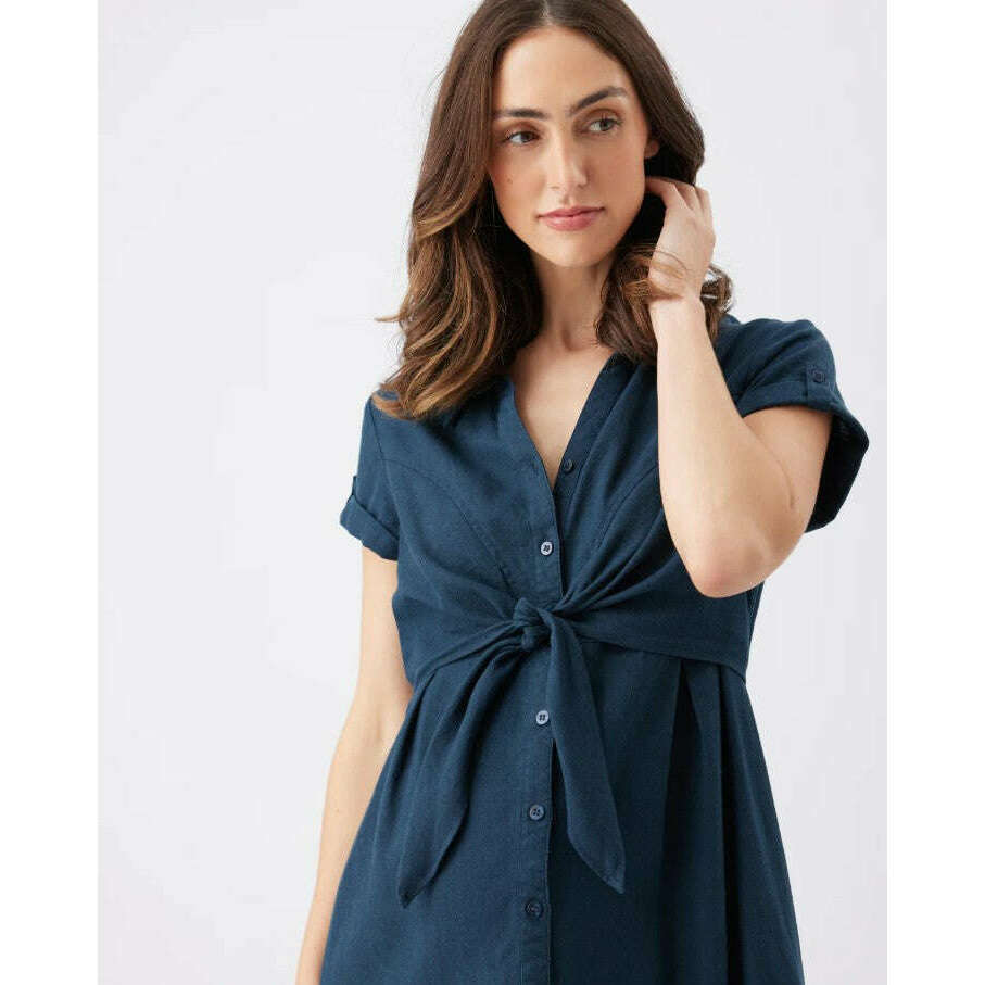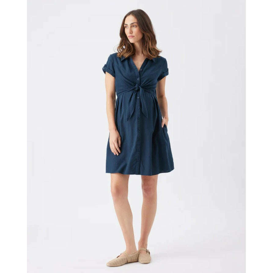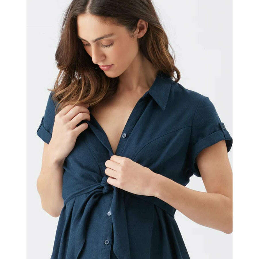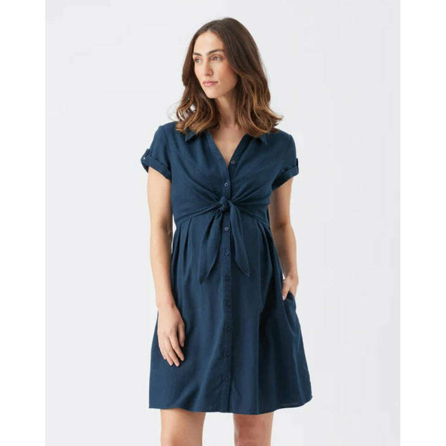 Ease into summer in the Colette Tie Up Linen Dress. Cut from a soft breathable Viscose Linen blend, this daytime dress features an a-line silhouette and a nursing friendly button through placket.